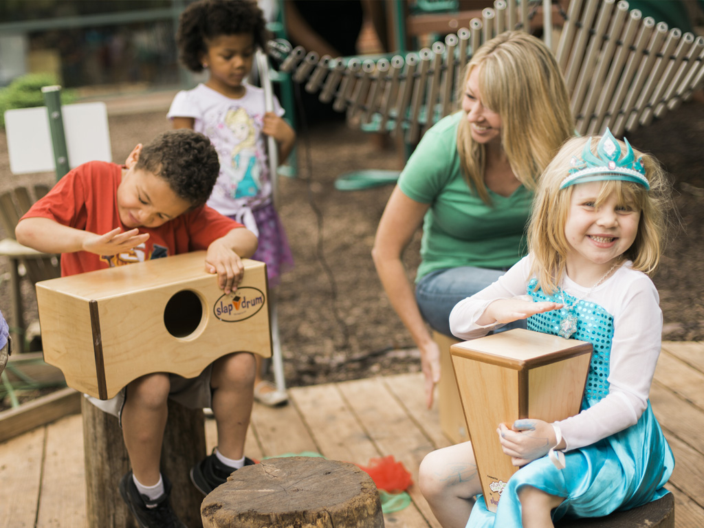 Children can hold the SlapDrum® between their thighs and slap the top of the instrument to experiment with tone and speed. Children can mimic the sounds and rhythms of nature they hear around them, or use their creativity to experiment with new sounds.